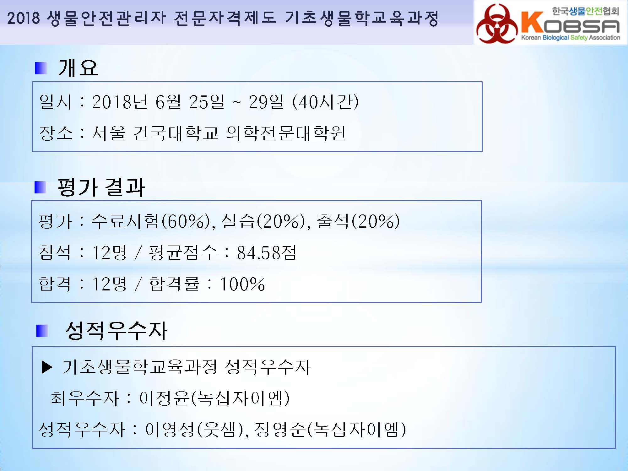 2018년 생물안전관리자 전문자격제도 기초생물학교육과정 교육보고