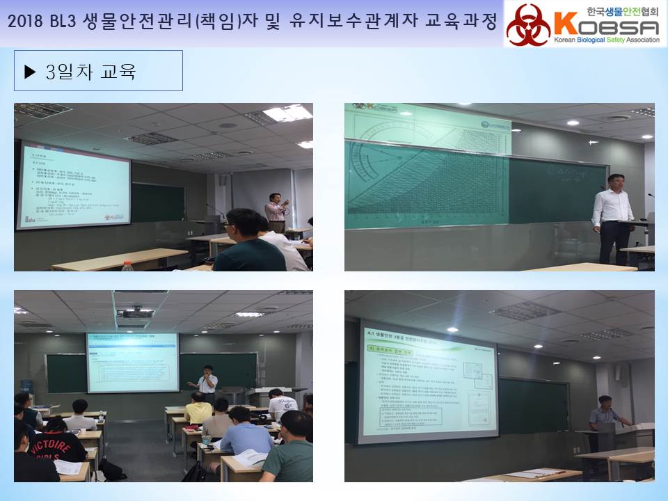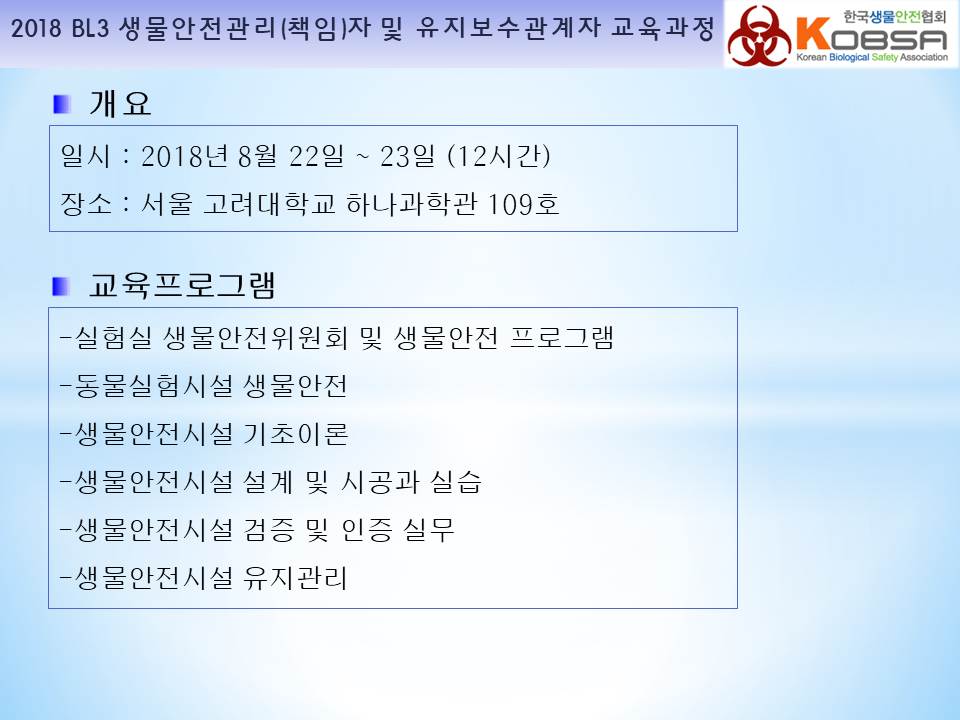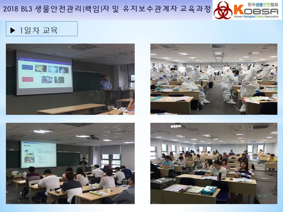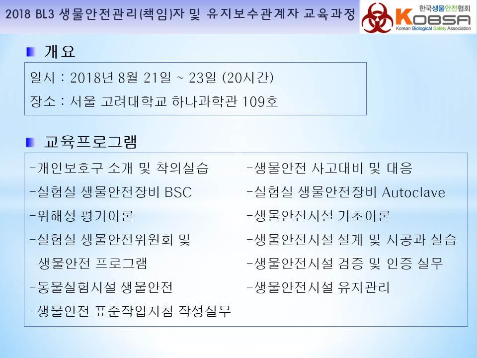 2018년 생물안전3등급 연구시설 생물안전관리(책임)자 및 전문위탁기관 유지보수관계자 지정교육을 서울 고려대학교 하나과학관에서 다음과 같이 진행하였습니다.