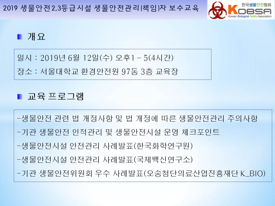 2019 생물안전2,3등급시설 생물안전관리(책임)자 보수교육 교육보고 작성자 최고관리자 조회 1,552 작성일 2019-07-23 안녕하세요 한국생물안전협회입니다. 2019년 생물안전2,3등급 생물안전관리(책임)자 보수교육을 서울대학교 환경안전원에서 다음과 같이 진행하였습니다. 감사합니다. 이전글 다음글 목록