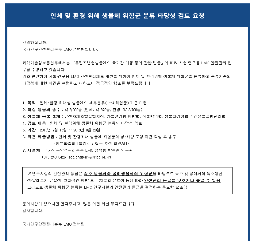 [홍보]인체 및 환경 위해 생물체 위험군 분류 타당성 검토 요청 작성자 최고관리자 조회 1,360 작성일 2019-07-24 안녕하세요 한국생물안전협회입니다. 국가연구안전관리본부에서 인체 및 환경 위해 생물체 위험군 분류 타당성 검토를 다음과 같이 요청하고 있습니다. 적극적인 협조 부탁드립니다. 감사합니다. 첨부파일 인체 및 환경위해 생물체 위험군 분류 타당성 검토.hwp 이전글 다음글 목록