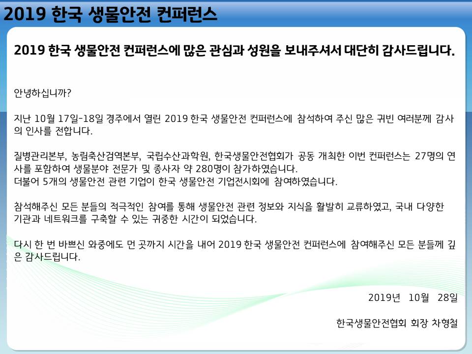2019 한국 생물안전 컨퍼런스 참가자 여러분께 감사의 말씀 드립니다.