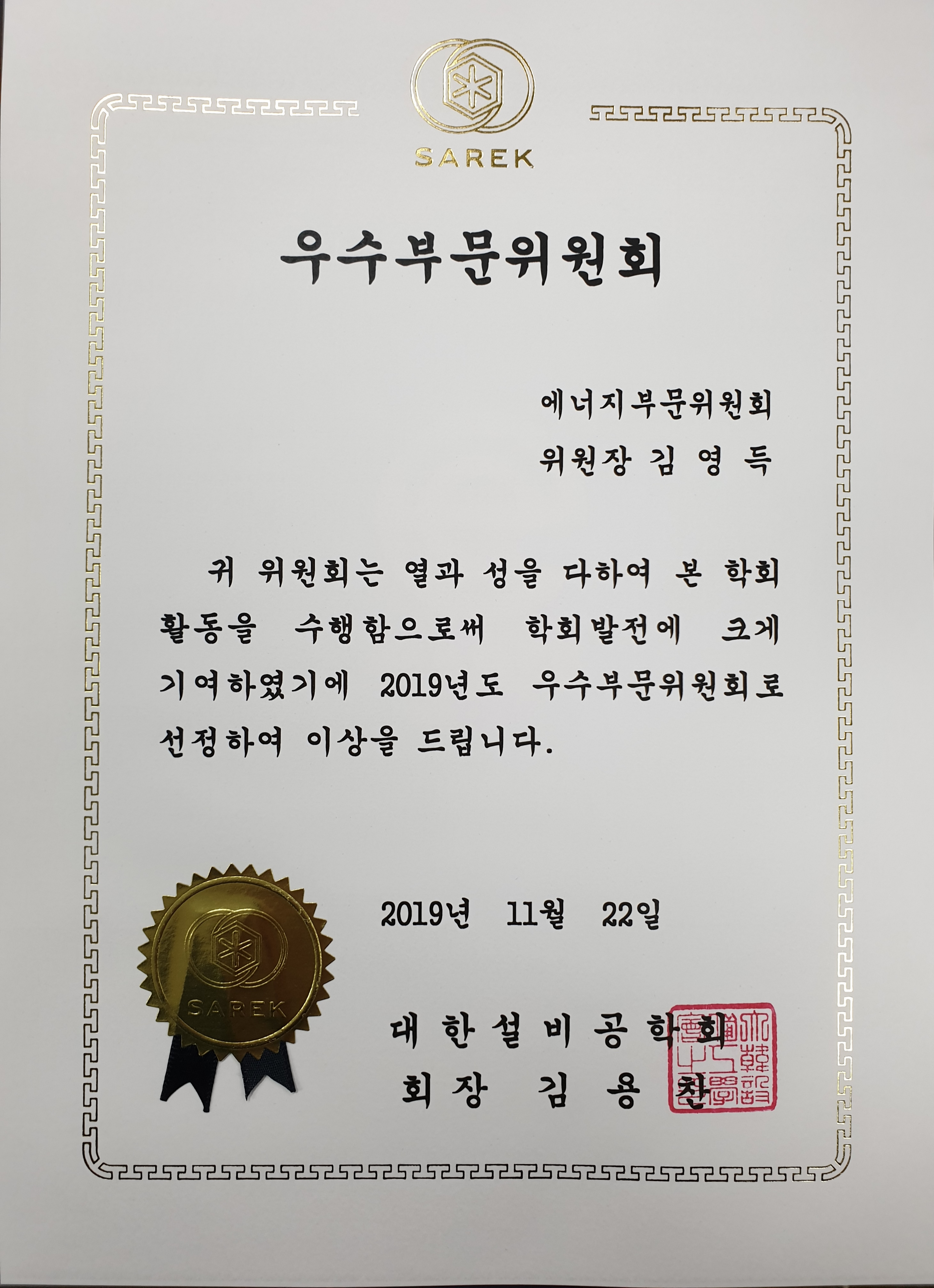 [홍보] 대한설비공학회 에너지 부문위원회(위원장 김영득 교수) 우수 위원회 활동상 수상 작성자 최고관리자 조회 1,584 작성일 2019-12-19 안녕하세요 한국생물안전협회입니다. 협회 임원 김영득 수석부회장님 대한설비공학회 에너지 부문위원회 우수 위원회 활동상 수상 소식을 전합니다. 김영득 수석부회장님 수상을 축하드립니다. 이전글 다음글 목록