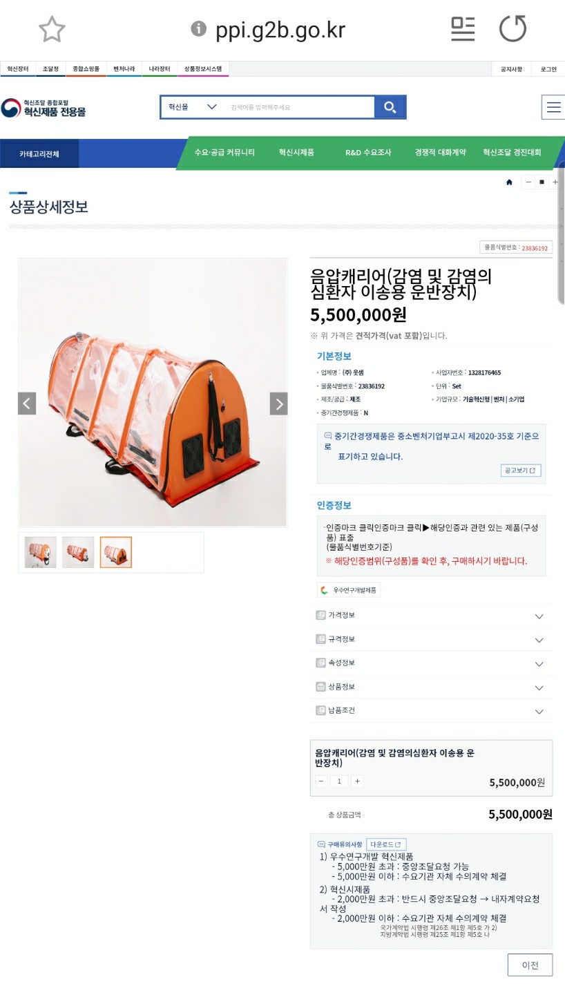 [홍보] (주)웃샘 음압캐리어 혁신제품 지정 및 등록 완료 작성자 최고관리자 조회 2,679 작성일 2020-08-31 안녕하세요 한국생물안전협회입니다. 회원사 (주)웃샘의 음압캐리어 혁신제품 지정 및 등록 완료 소식을 전합니다. 제품 확인은 조달청(www.pps.go.kr) → 혁신 장터 → 혁신제품 전용몰 → 건강/의료 카테고리에서 확인 가능합니다. 감사합니다. 첨부파일 1번.jpg2번.jpg 이전글 다음글 목록