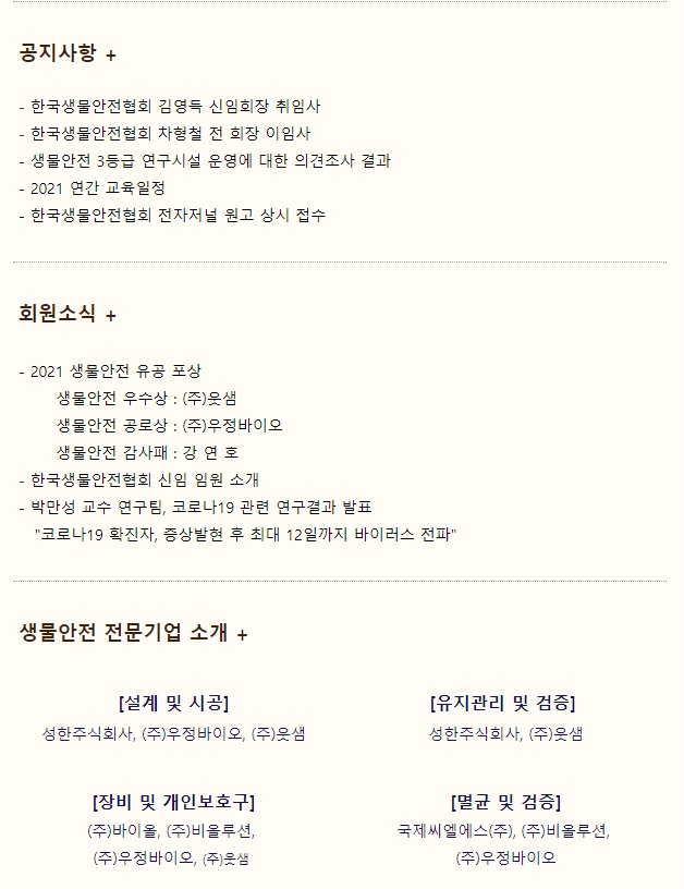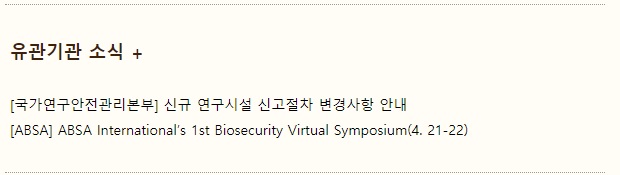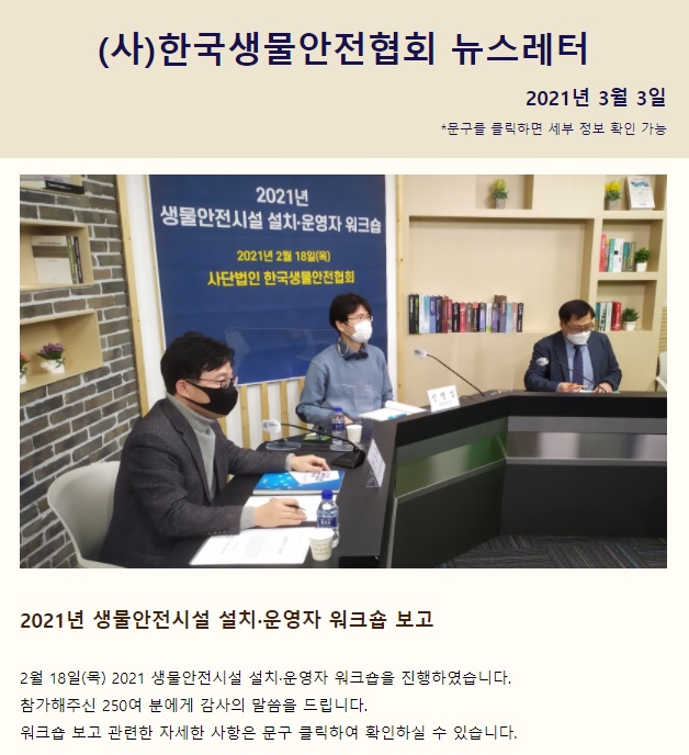 뉴스레터 (2021.03) 작성자 홈페이지 관리자 조회 1,590 작성일 2021-06-09 한국생물안전협회는 협회 소식과 생물안전 관련 정보를 담은 뉴스레터를 격월로 발송하고 있습니다. 뉴스레터 수신을 원하시는 경우 협회 메일(kobsa@hanmail.net)로 문의 바랍니다. 이전글 다음글 목록