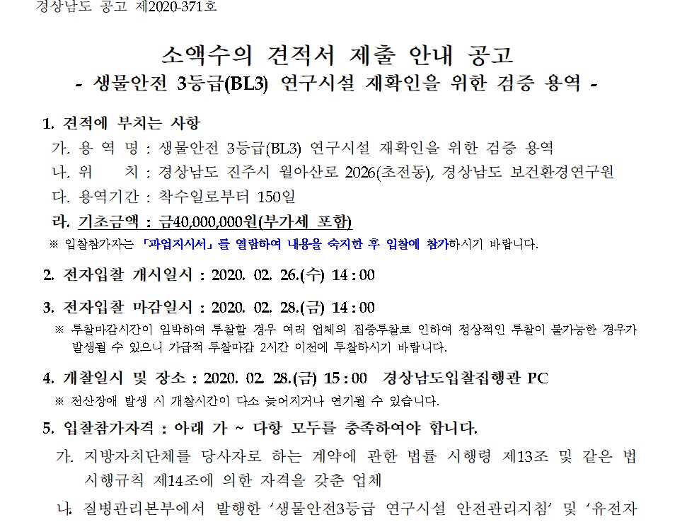 경상남도 공고 제 2020-371호 "생물안전 3등급(BL3) 연구시설 재확인을 위한 검증 용역"을 안내드립니다.