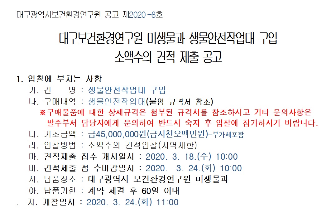 [나라장터] 대구보건환경연구원 생물안전작업대 구입 소액수의 견적 입찰공고 (2020.03.18-2020.03.24) 작성자 최고관리자 조회 344 작성일 2020-03-18 안녕하세요. 한국생물안전협회입니다. 대구광역시보건환경연구원 공고 20200332295-00 생물안전작업대 구입 소액수의 견적 입찰공고를 안내드립니다. 감사합니다. 이전글 다음글 목록