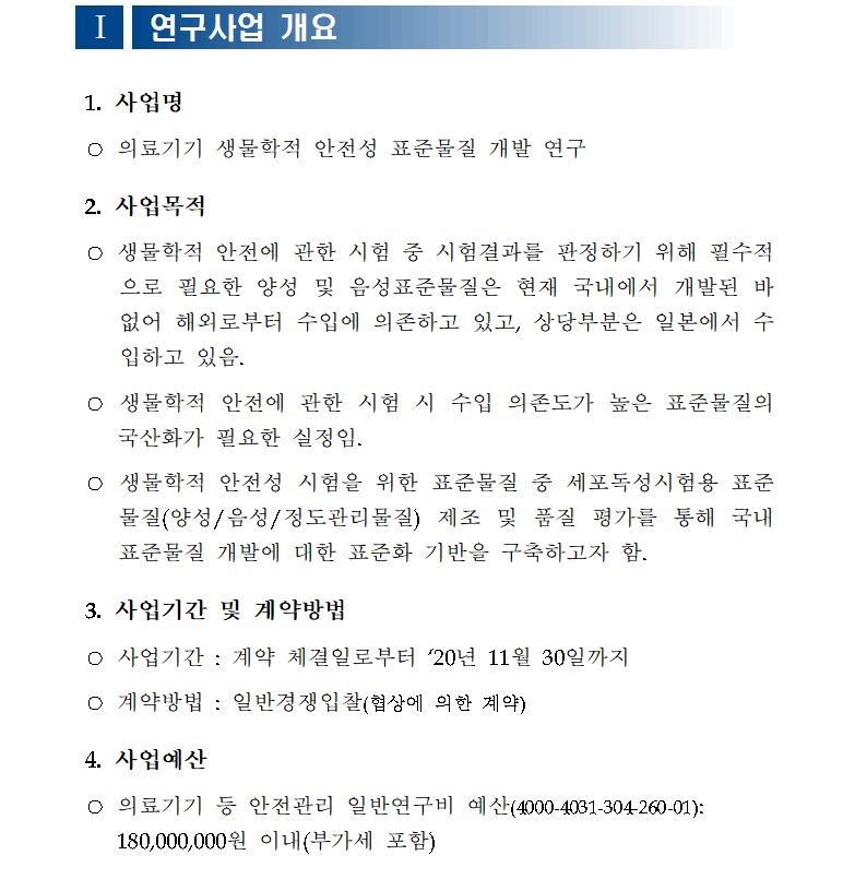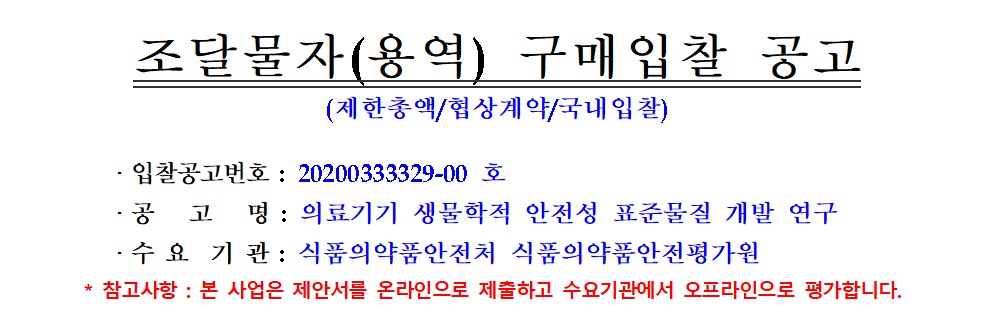 [나라장터] 의료기기 생물학적 안전성 표준물질 개발 연구 (20203.31~04.02) 작성자 최고관리자 조회 319 작성일 2020-03-19 안녕하세요. 한국생물안전협회입니다. 대전지방조달청 공고 20200333329-00 "의료기기 생물학적 안전성 표준물질 개발 연구"를 안내드립니다. 자세한 사항은 나라장터(바로가기)를 확인해주세요. 감사합니다. 이전글 다음글 목록