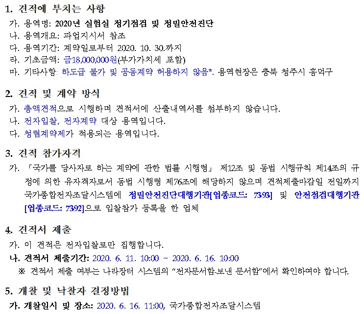 [나라장터] 2020년 실험실 정기점검 및 정밀안전진단(06.11~06.16) 작성자 최고관리자 조회 218 작성일 2020-06-10 안녕하세요. 한국생물안전협회입니다. 질병관리본부 공고 '2020년 실험실 정기점검 및 정밀안전진단' 용역을 안내드립니다. [나라장터 바로가기] 감사합니다. 이전글 다음글 목록