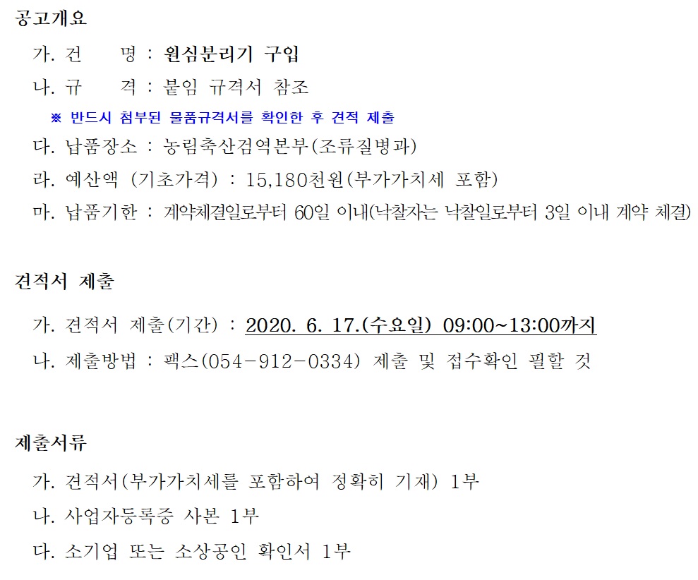 [농림축산검역본부] 원심분리기 구매 견적 공고(~06.17) 작성자 최고관리자 조회 218 작성일 2020-06-15 안녕하세요. 한국생물안전협회입니다. 농림축사검역본부 원심분리기 구매 견적 공고를 안내드립니다. 감사합니다. [출처 : 농림축산검역본부] 이전글 다음글 목록