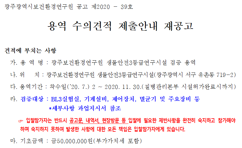[나라장터] 광주보건환경연구원 생물안전 3등급 연구시설 검증 용역(~7.7) 작성자 최고관리자 조회 245 작성일 2020-06-24 안녕하세요. 한국생물안전협회입니다. 광주보건환경연구원 생물안전 3등급 연구시설 검증 용역을 안내드립니다. [나라장터 바로가기] 감사합니다. 이전글 다음글 목록
