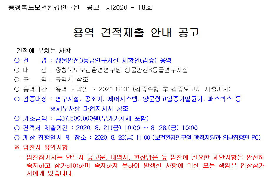 [나라장터] 생물안전 3등급 연구시설 재확인(검증) 용역 (~8.28) 작성자 최고관리자 조회 226 작성일 2020-08-24 안녕하세요. 한국생물안전협회입니다, 충청북도보건환경연구원 공고 '생물안전 3등급 연구시설 재확인(검증)'을 안내드립니다. 감사합니다. [나라장터 바로가기] 이전글 다음글 목록
