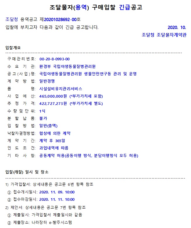 [나라장터] 국립야생동물질병관리원 생물안전연구동 관리 및 운영 긴급공고(~11.11) 작성자 최고관리자 조회 285 작성일 2020-11-03 안녕하세요. 한국생물안전협회입니다. 국립야생동물질병관리원 생물안전연구동 유지관리 공고를 안내드립니다. [나라장터 바로가기] 감사합니다. 이전글 다음글 목록