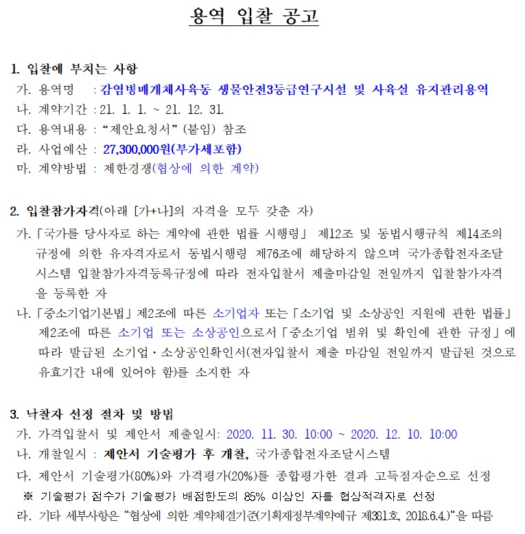 [나라장터] 감염병매개체사육동 생물안전3등급연구시설 및 사육실 유지관리용역 (~12.10) 작성자 최고관리자 조회 325 작성일 2020-11-30 안녕하세요. 한국생물안전협회입니다. 질병관리청 공고 감염병매개체사육동 생물안전 3등급 연구시설 및 사육실 유지관리용역을 안내드립니다. [나라장터 바로가기] 감사합니다. 이전글 다음글 목록