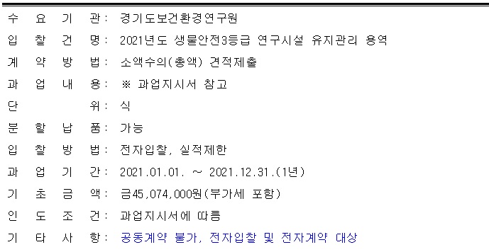 [나라장터] 2021년 생물안전 3등급 연구시설 유지관리 용역 (~12.09) 작성자 최고관리자 조회 336 작성일 2020-12-07 안녕하세요. 한국생물안전협회입니다. 경기도보건환경연구원 2021년 생물안전 3등급 연구시설 유지관리 용역 공고를 안내드립니다. 자세한 사항은 링크[바로가기]를 확인 바랍니다. 감사합니다. 이전글 다음글 목록