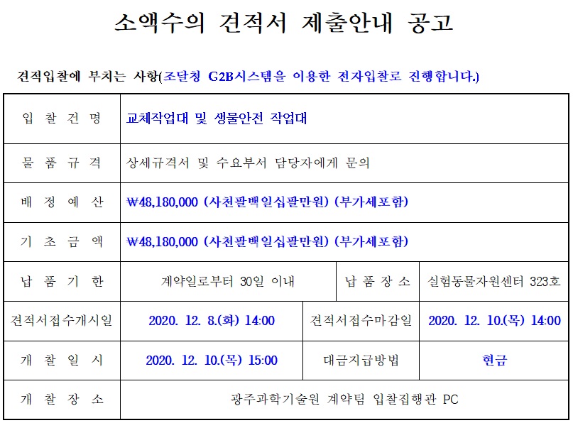[나라장터] 교체작업대 및 생물안전작업대 (~12.10) 작성자 최고관리자 조회 349 작성일 2020-12-07 안녕하세요. 한국생물안전협회입니다. 광주과학기술원 교체작업대 및 생물안전작업대 공고를 안내드립니다. 자세한 사항은 링크[바로가기]를 확인 바랍니다. 감사합니다. 이전글 다음글 목록