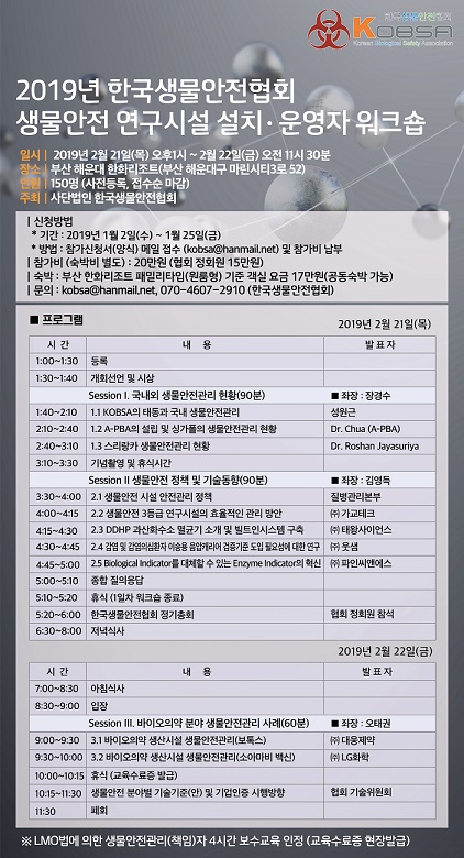 2019 생물안전 연구시설 설치·운영자 워크숍 참가 안내