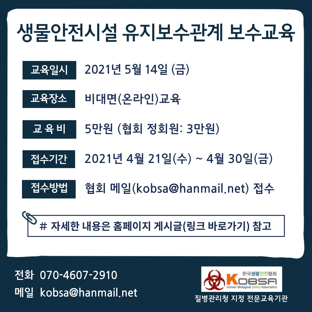 [교육공지] 2021년 1차 생물안전시설 유지보수관계자 보수교육 안내(~4.30까지 접수)