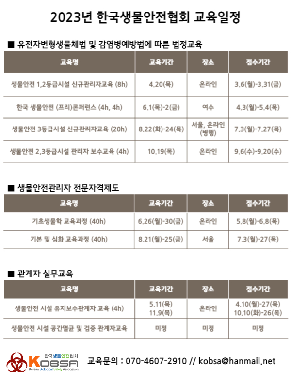 2023년 한국생물안전협회 생물안전 교육일정을 첨부와 같이 공지하오니 업무 참조 바랍니다.