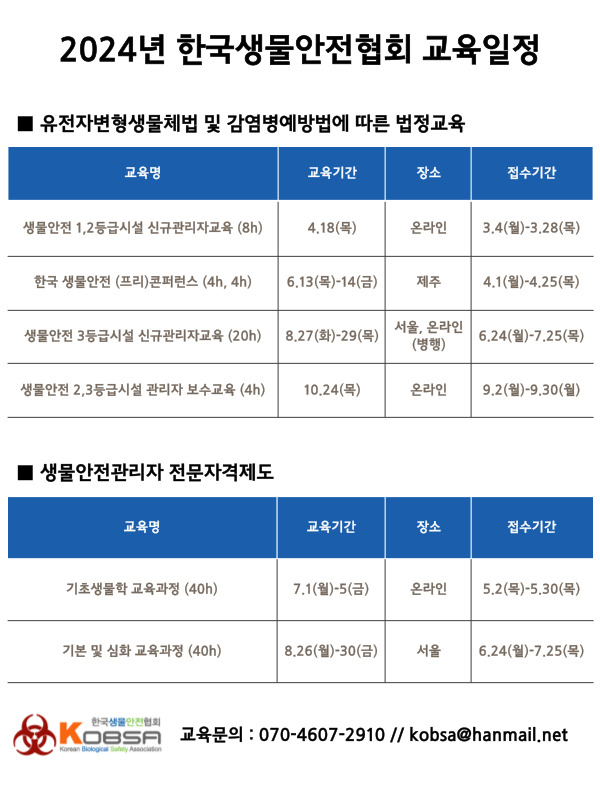2024년 한국생물안전협회 생물안전 교육일정을 첨부와 같이 공지하오니 업무 참조 바랍니다.