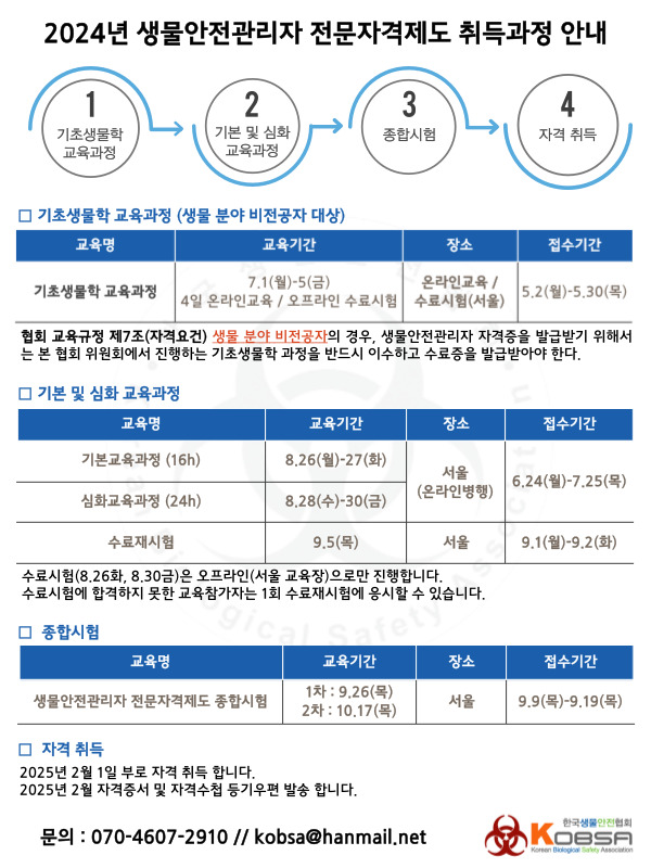 2024년 생물안전관리자 전문자격제도 기초생물학 교육과정 안내(~5.30까지 접수)