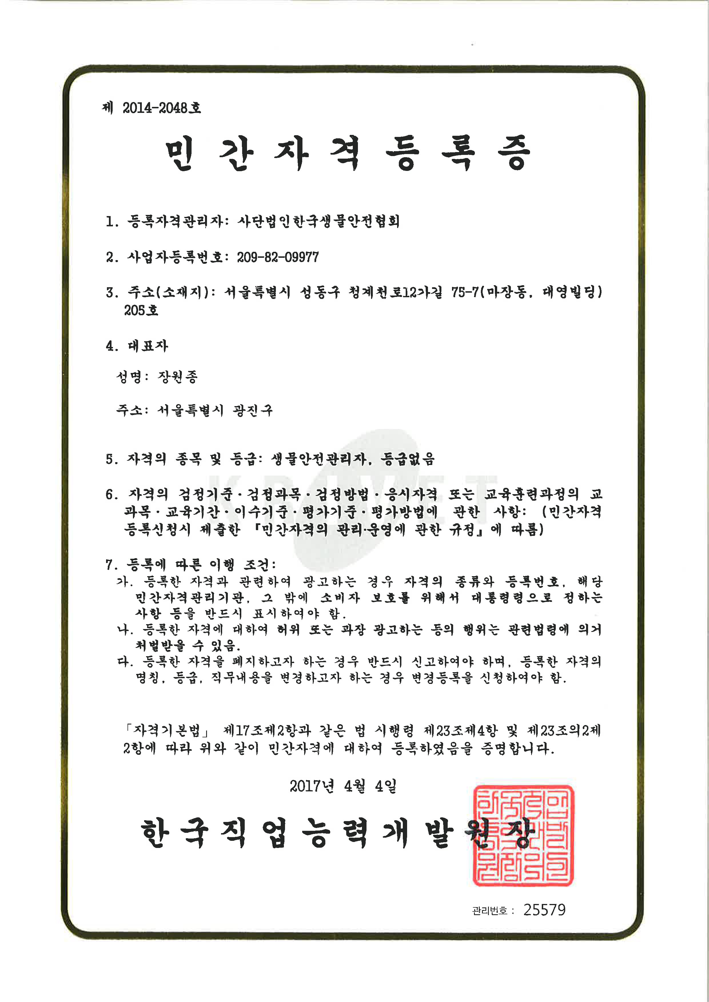 ★ 발급기관명 : 사단법인한국생물안전협회