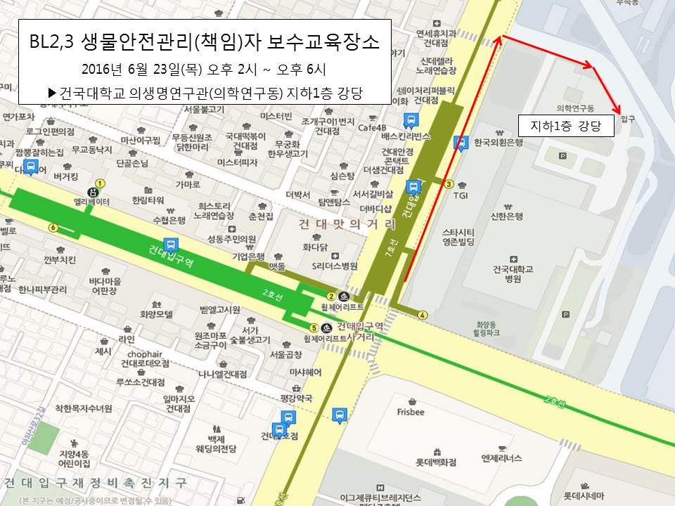 생물안전2,3등급연구시설 생물안전관리책임자 및 생물안전관리자 보수교육 장소안내입니다.
