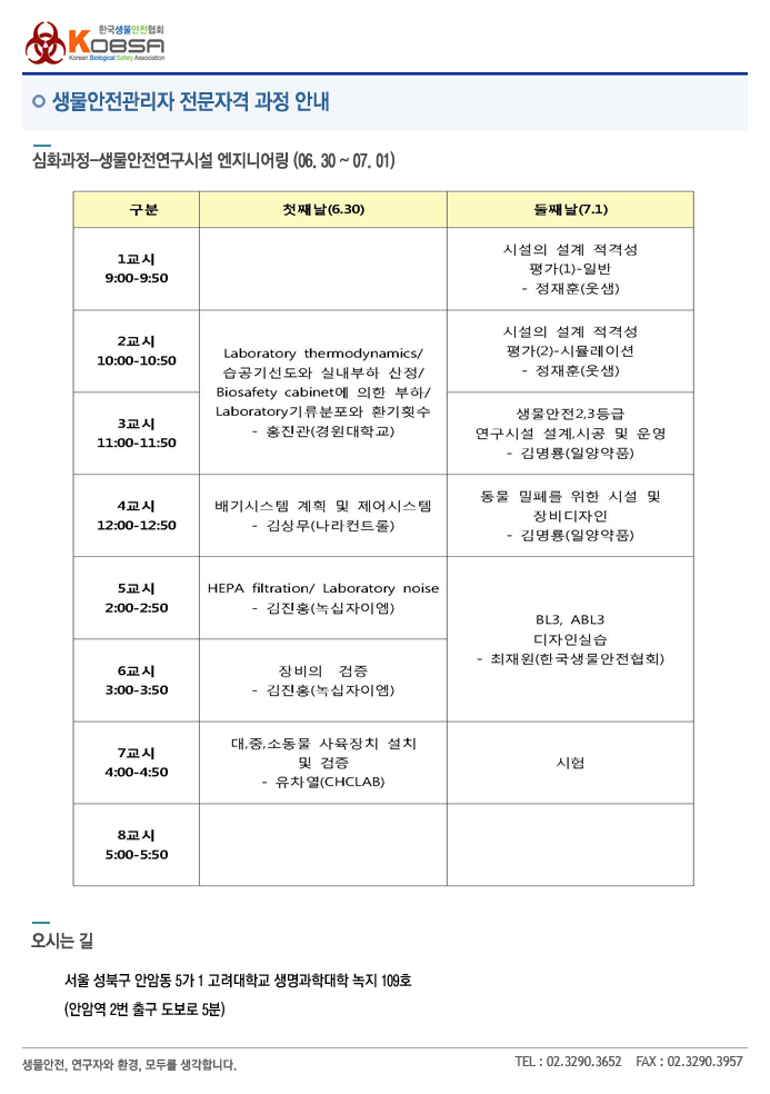 [생물안전관리자 전문자격- 생물안전연구시설 엔지니어링] 세부일정 작성자 KOBSA 조회 3,710 작성일 2011-06-14 돌아오는 6월 30일부터 7월 1일까지 있는 생물안전연구시설 엔지니어링 교육 시간표를 안내드립니다.오시는 길은 첨부파일 참고하시기 바랍니다. 첨부파일 오시는 길(녹지관).hwp심화교육과정2.pdf 이전글 다음글 목록