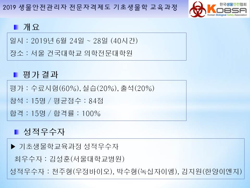 2019 생물안전관리자 전문자격제도 기초생물학 교육과정 교육보고 작성자 최고관리자 조회 31,557 작성일 2019-07-23 안녕하세요 한국생물안전협회입니다. 2019년 생물안전관리자 전문자격제도 기초생물학 교육과정을 서울 건국대학교 의학전문대학원에서 다음과 같이 진행하였습니다. 감사합니다. 이전글 다음글 목록