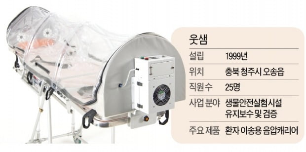 국내 한 중소기업이 전량 수입에 의존하던 음압캐리어를 독자 기술로 개발했다. 충북 청주시의 생물안전시설 전문업체 웃샘은 특허기술인 가스프레임을 적용한 음압캐리어 300개를 최근 전국 지방자치단체에 납품했다. 2015년 메르스(중동호흡기증후군) 사태를 겪으면서 신종 감염병이 5~6년마다 창궐한다는 사실에 착안해 일찍이 제품 개발에 뛰어든 결과다.