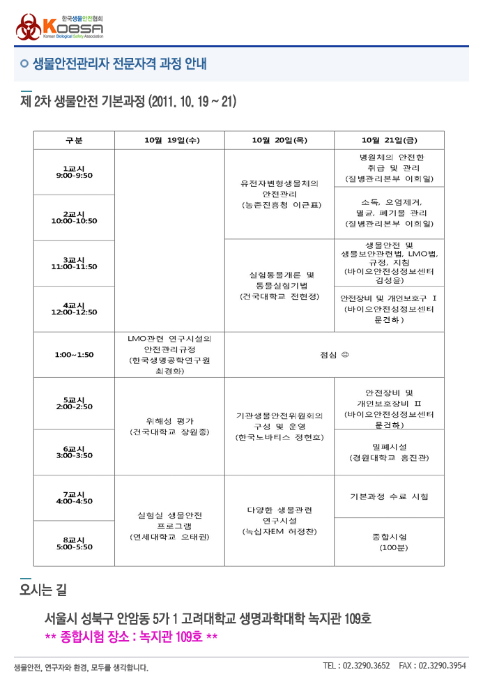 [생물안전관리자 전문자격제도] - 제 2차 생물안전 기본과정 시간표가 다음과 같습니다.