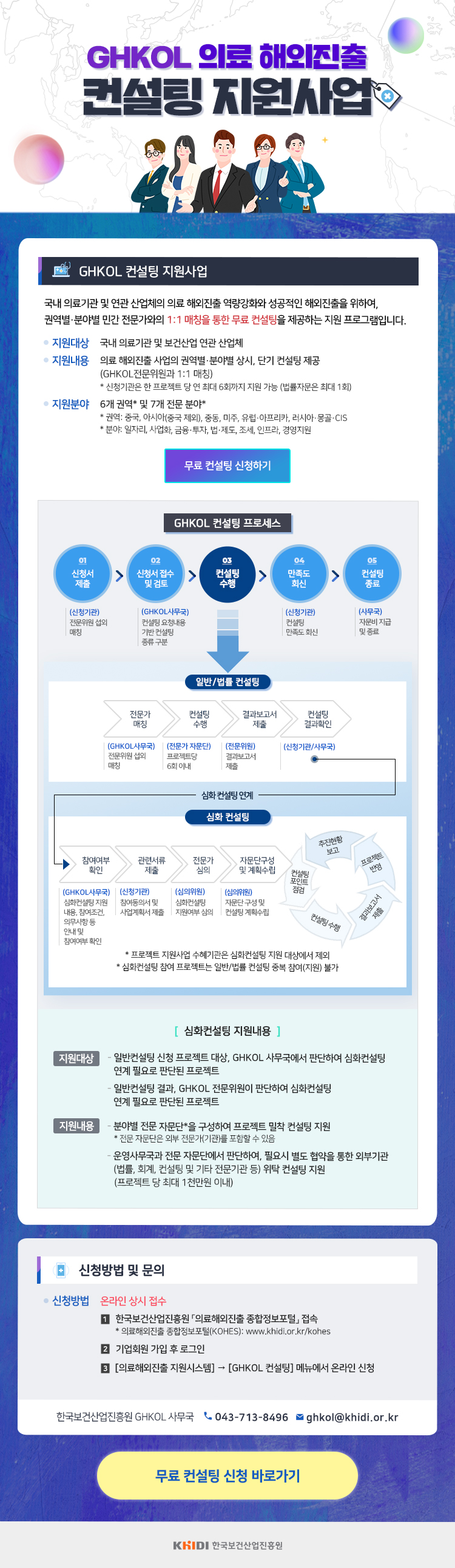 한국보건산업진흥원, GHKOL 의료해외진출 컨설팅 지원안내 작성자 홈페이지 관리자 조회 1,963 작성일 2021-06-01 안녕하세요. 한국생물안전협회입니다. GHKOL 의료해외진출 컨설팅 지원을 안내드립니다. 자세한 사항은 보건산업진흥원 홈페이지(바로가기 링크) 참고 바랍니다. 감사합니다. 이전글 다음글 목록