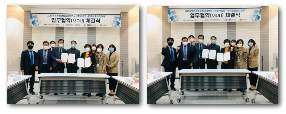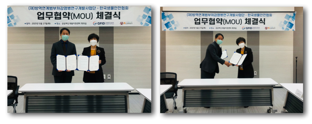 사단법인 한국생물안전협회와 공익재단법인 방역연계범부처감염병연구개발사업단은 5월 27일(목) 충북 오송 공공백신개발지원센터에서 코로나19 등 신종감염병 방역시스템 활성화를 위한 민관 협력을 강화하고자 업무협약(MOU) 체결식을 진행하였다.
