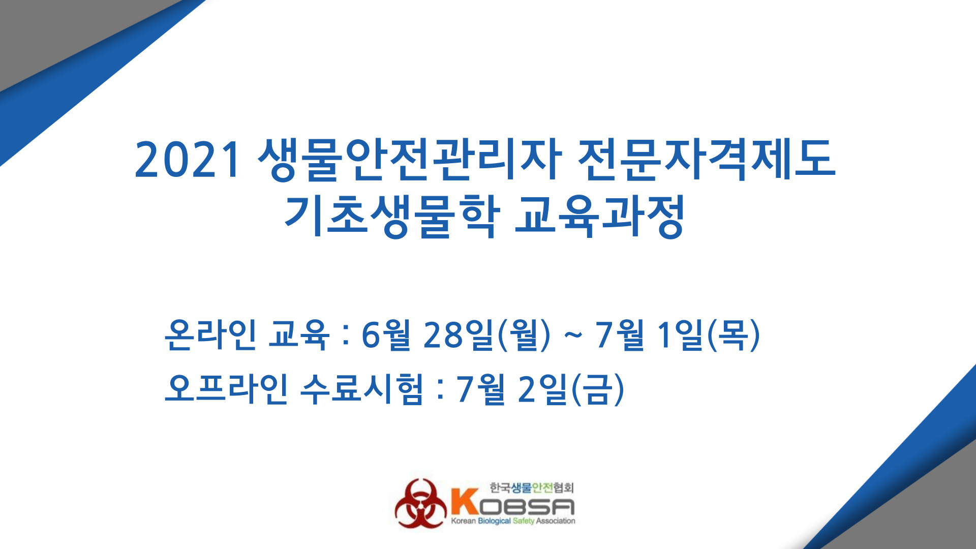 2021 생물안전관리자 전문자격제도 기초생물학 교육과정을 비대면(온라인)으로 진행하였습니다.