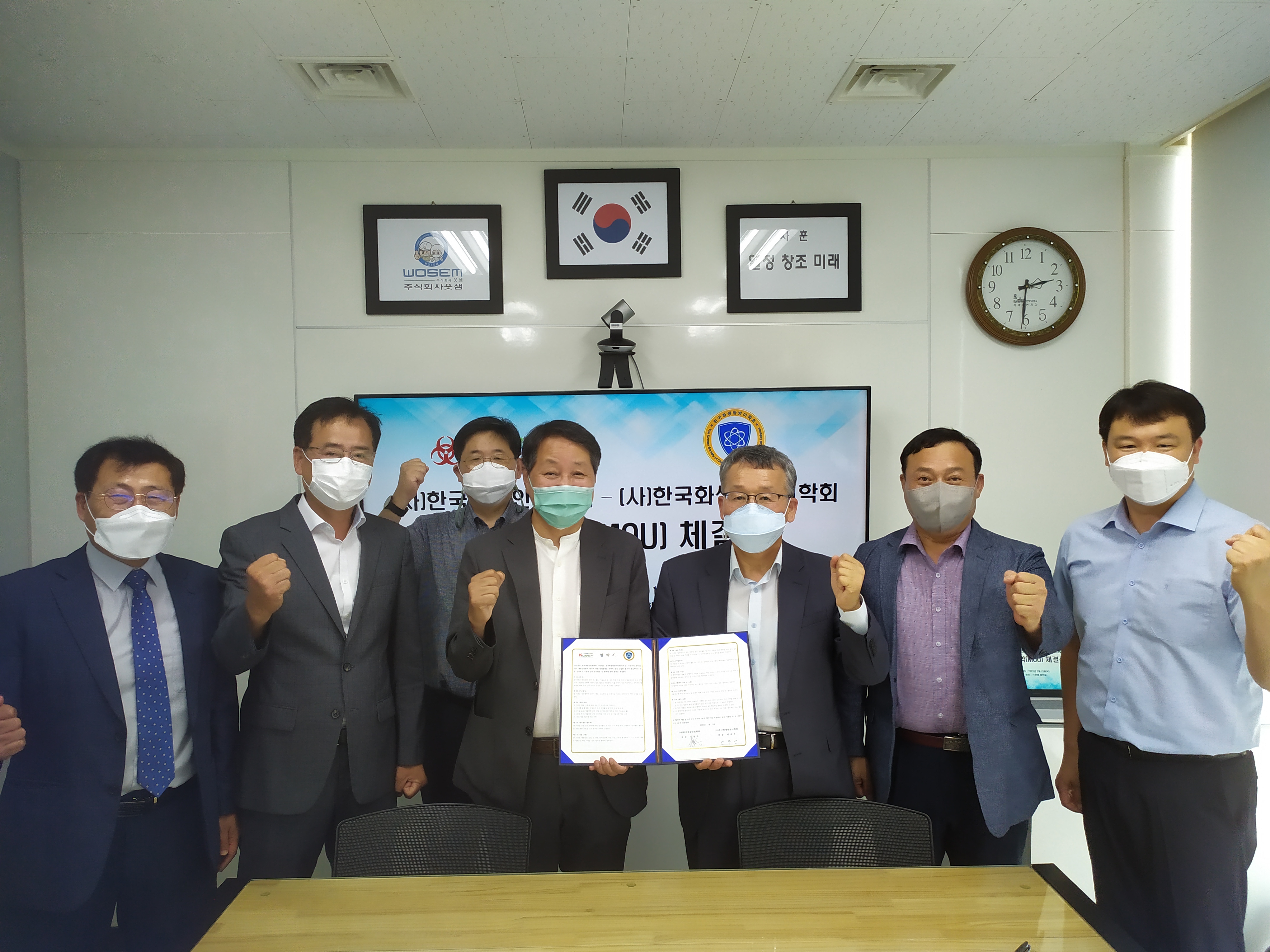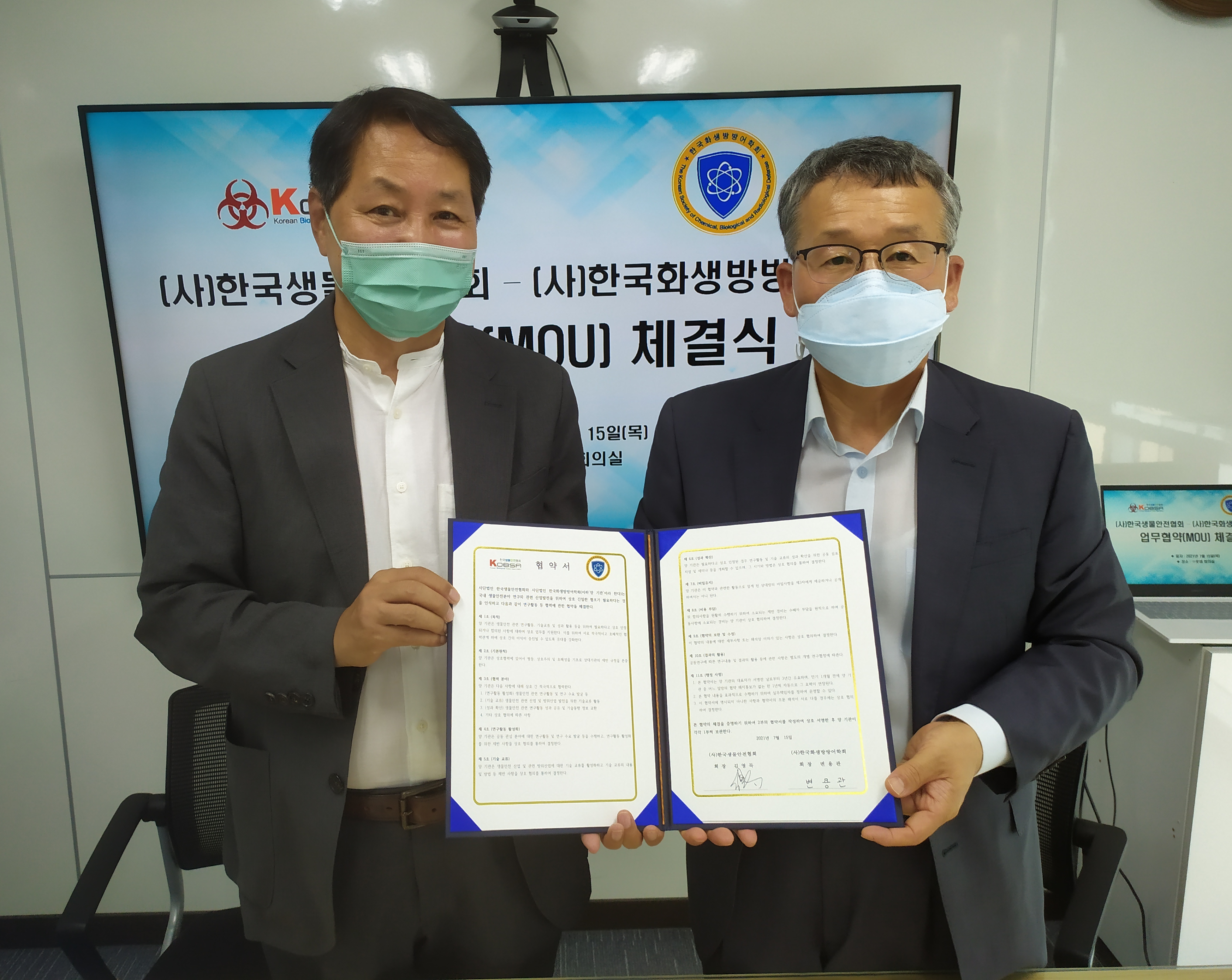 사단법인 한국생물안전협회와 사단법인 한국화생방방어학회는 7월 15일(목) 충북 오송에서 생물안전 및 국가 방위산업 발전과 관련 연구활동 활성화를 위한 민관 협력을 강화하고자 업무협약(MOU) 체결식을 진행하였습다. 업무협약의 주요내용은 양 기관의 특성과 전문성을 활용하여 공동연구활동 및 수요 발굴, 방위산업 발전을 위한 생물안전 관련 기업의 기술 교류와 제반 협력활동, 그리고 연구성과의 활용 및 확대를 위한 교류활동이다. 국내 생물안전분야 전문가와 관련 기업이 참여하고 있는 한국생물안전협회와 화학, 생물, 방사능분야에서 국가 방위산업과 관련 연구활동을 하는 한국화생방방어학회와의 업무협력을 통해 향후 코로나 19등 감염병 유행에 대응하는 국가방역시스템과 국가방위시스템의 강화와 관련 산업 발전에 크게 기여할 것으로 기대된다.