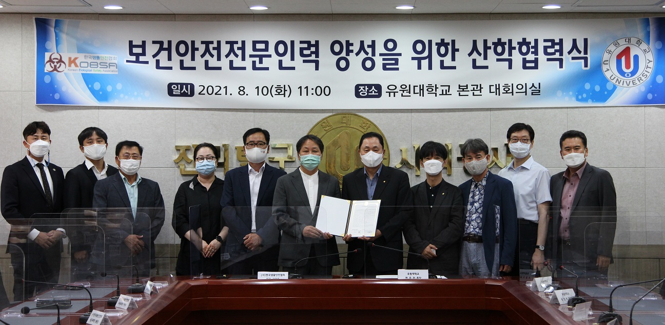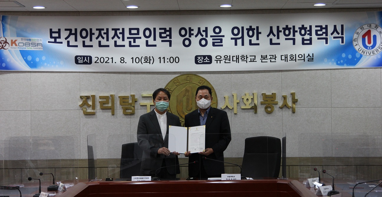 사단법인 한국생물안전협회와 유원대학교는 8월 10일(화) 충북 영동 유원대학교에서 보건안전 전문인력 양성을 위한 산학협력을 강화하고자 업무협약(MOU) 체결식을 진행하였다. 업무협약식에는 (사)한국생물안전협회 김영득 회장, 이명식 수석부회장, 성원근 상근부회장, 강지영 부회장 등이 참석하였고 유원대학교에서는 채훈관 총장을 비롯하여 조용구 부총장, 신범식 교무학생처장, 오상영 산학협력단장 등이 참석하였다. 업무협약을 통해 양 기관은 생물안전 분야 인력양성을 위한 정보 교환, 교육과정 및 교재 공동 개발, 학생의 현장 실습 및 취업 지원 등 국내 최초로 생물안전 전문인력을 양성할 수 있는 전문학과를 개설하고 활성화하는데 상호 협력하기로 하였다.