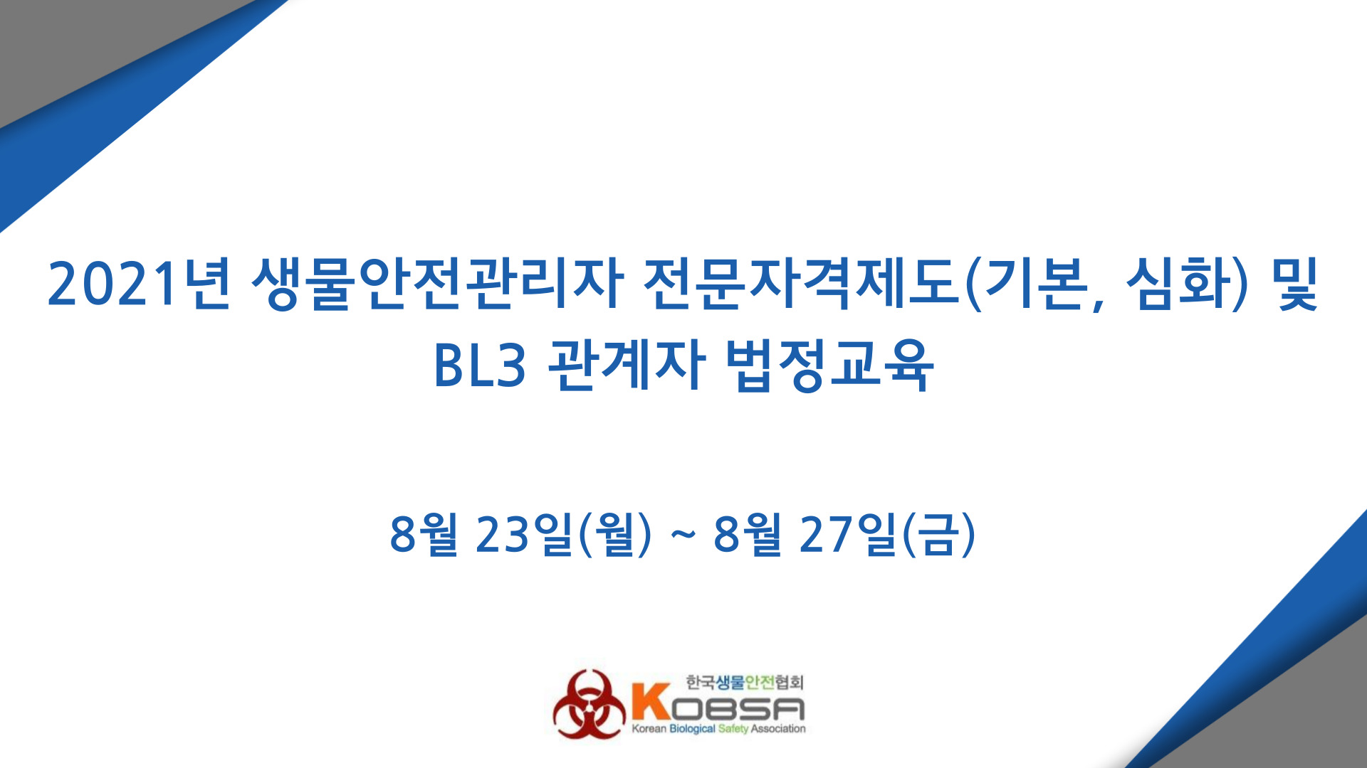 2021 생물안전관리자 전문자격제도(기본,심화) 및 BL3 관계자 법정교육을 비대면(온라인)으로 진행하였습니다.