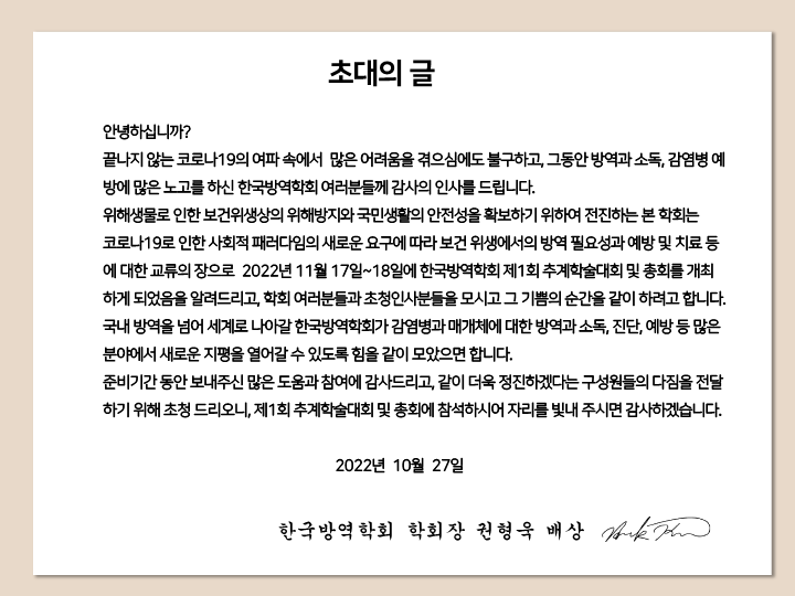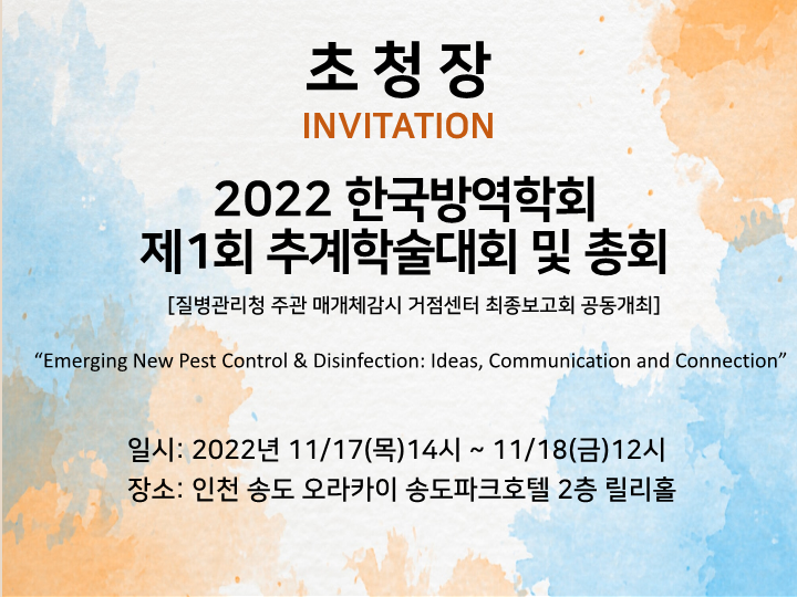 2022년 제1회 한국방역학회 추계학회 개최안내(11.17) 작성자 홈페이지 관리자 조회 762 작성일 2022-11-04 첨부파일 (공문) 2022년 제1회 한국방역학회 추계학회 개최안내.pdf2022 추계학회 숙박신청서.docx2022 한국방역학회 추계학술대회_질병청_최종보고회_프로그램일정.pdf2022 추계학회 한국방역학회 초청장.pdf 이전글 다음글 목록