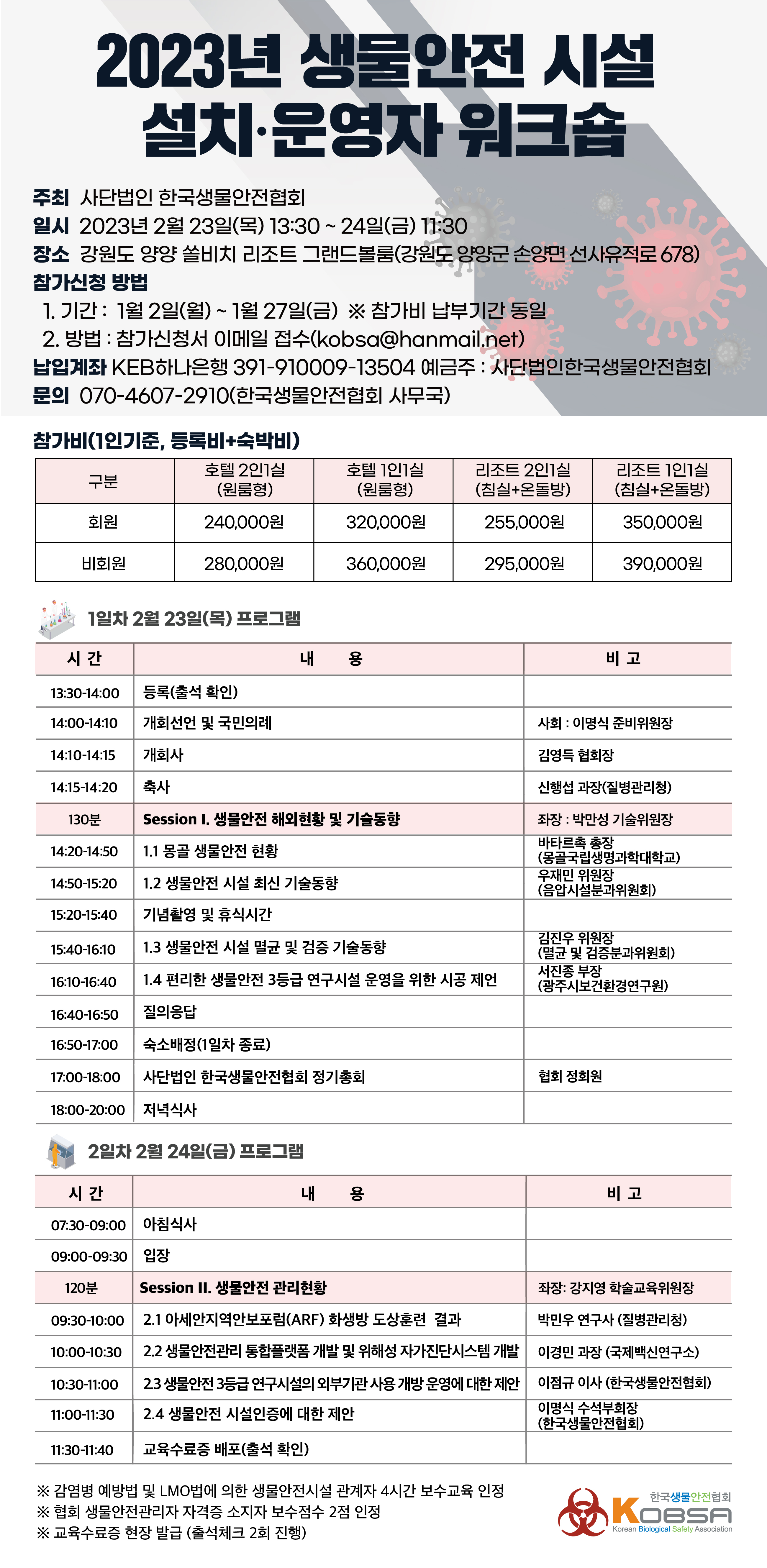 2023년 생물안전시설 설치·운영자 워크숍 안내 (2.23-2.24)