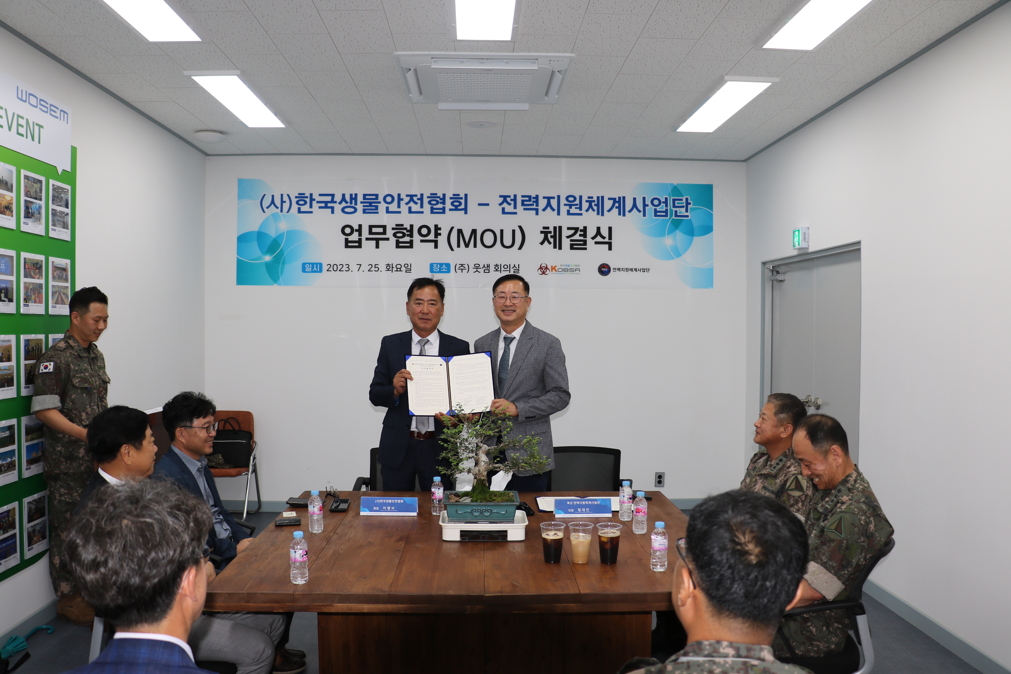2023.07.25(화) 충북 청주시 옥산면 소재 ㈜웃샘에서(사)한국생물안전협회(회장 이명식)와 육군 전력지원체계사업단(단장 정대건)은 전력지원체계분야 발전 및 효율적인 사업 추진을 위하여 업무협약(MOU) 체결식을 진행하였다. 업무협약식에는 (사)한국생물안전협회 이명식 회장, 장경수 수석부회장, 윤홍익 부회장 등이 참석하였고 전력지원체계사업단에서는 정대건 단장 외 각 부서장 등 10여명이 참석하였다.