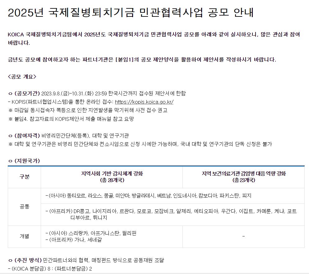 [KOICA] 2025년 국제질병퇴치기금 민관 협력사업 공모 안내(~10.31) 작성자 홈페이지 관리자 조회 983 작성일 2023-10-06 안녕하세요 한국생물안전협회입니다. 2025년 국제질병퇴치기금 민관협력사업 공모 안내입니다. 자세한 내용은 아래 링크를 클릭하여 확인 바랍니다. https://url.kr/2q8nou 감사합니다. 이전글 다음글 목록