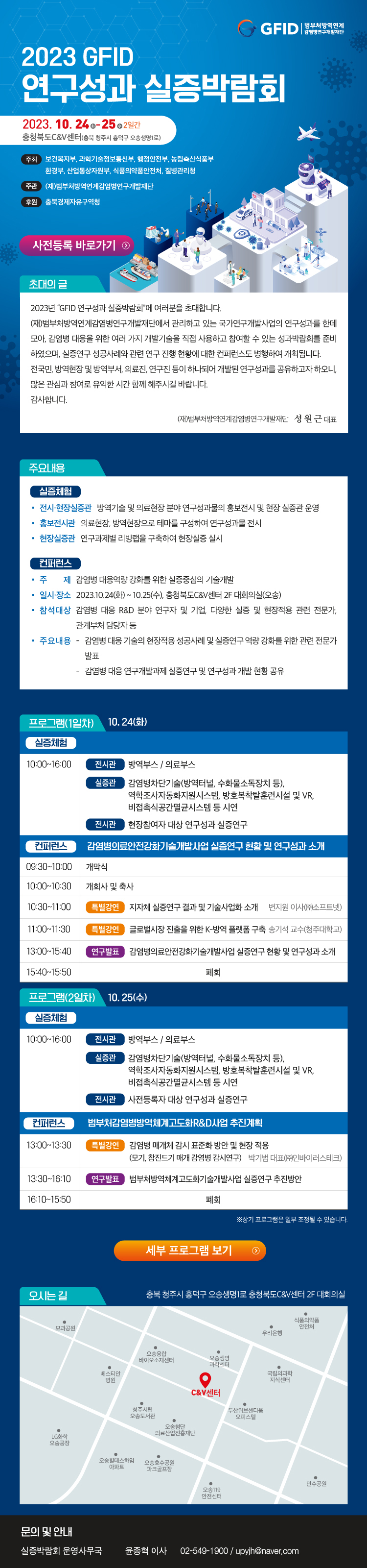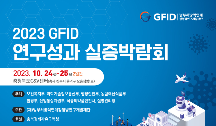 범부처방역연계감염병연구개발재단에서 연구성과 실증박람회를 10월 24일~25일 오송에서 진행합니다.