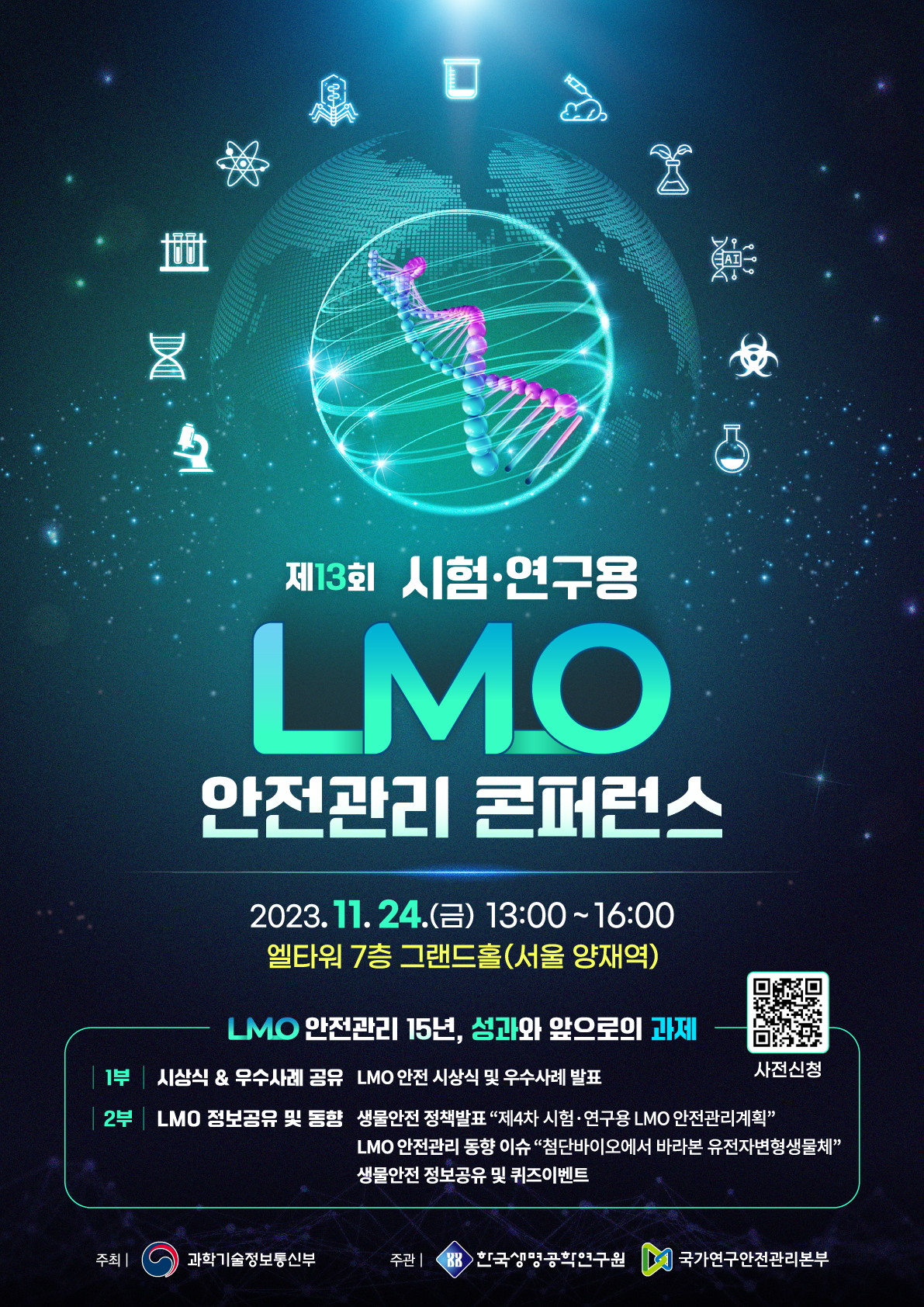 제13회 시험·연구용 유전자변형생물체 안전관리 콘퍼런스 개최(11.24) 작성자 홈페이지 관리자 조회 1,503 작성일 2023-11-16 콘퍼런스 참가신청 바로가기(하단 링크 클릭) https://www.lmosafety.or.kr/mps/competition/intro/53 첨부파일 「제13회 시험·연구용 유전자변형생물체 안전관리 콘퍼런스」개최 알림 및 참석협조 요청.pdf[붙임1] 제13회 시험·연구용 LMO 안전관리 콘퍼런스 개최 계획(안).hwpx 이전글 다음글 목록
