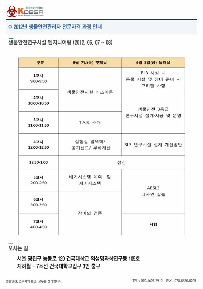 협회에서는 “생물안전관리자 자격인증(Certified Biological Safety Professional )제도”의 일환으로 2012년 5월 심화교육과정 1 에 이어 6월 심화교육과정 2_[생물안전연구시설 엔지니어링] 교육일정 및 내용에 대해 안내드리고자 하오니 많은 분들의 관심과 참여를 부탁드립니다.