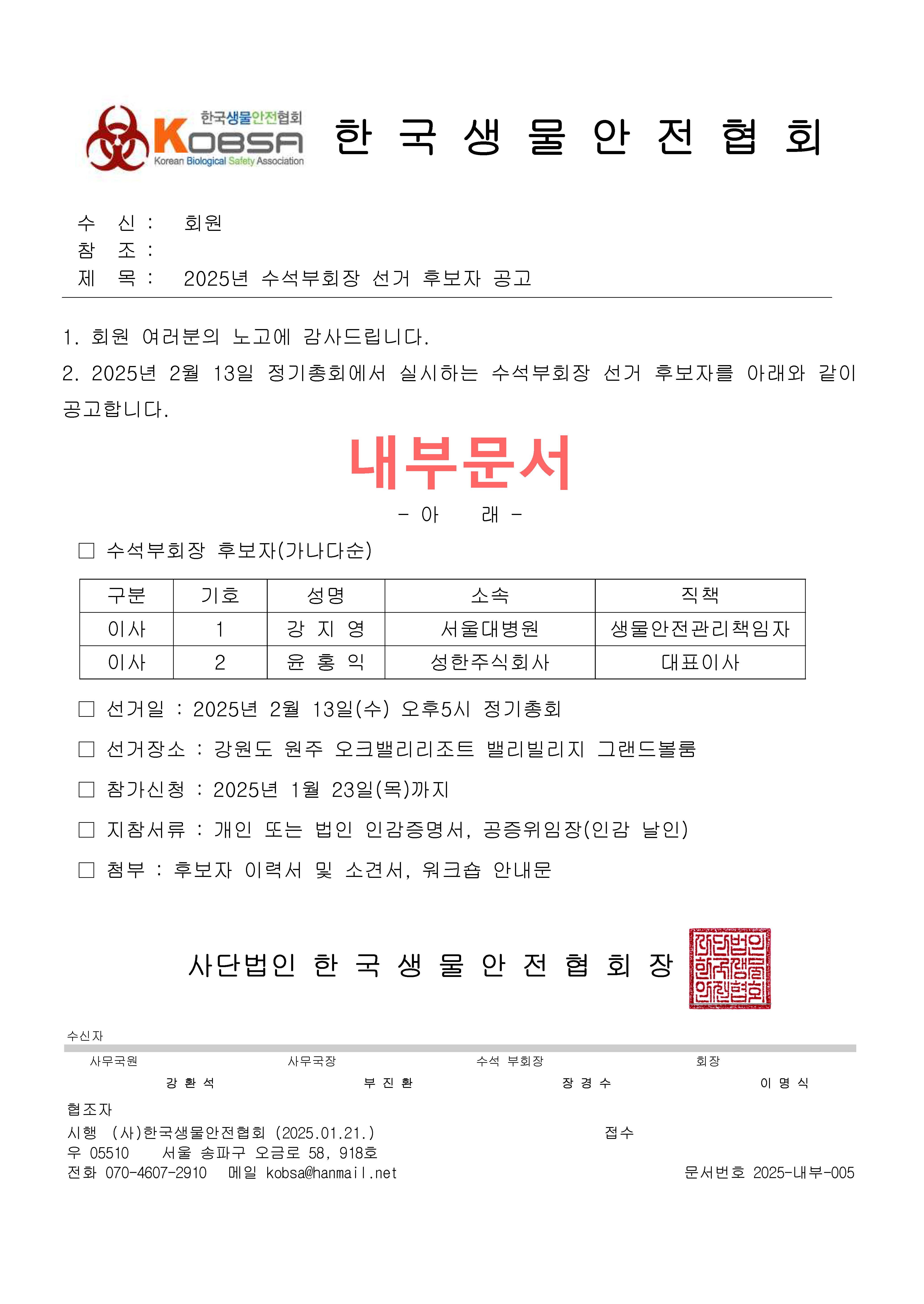 2025년 한국생물안전협회 수석부회장 선거 후보자 공고