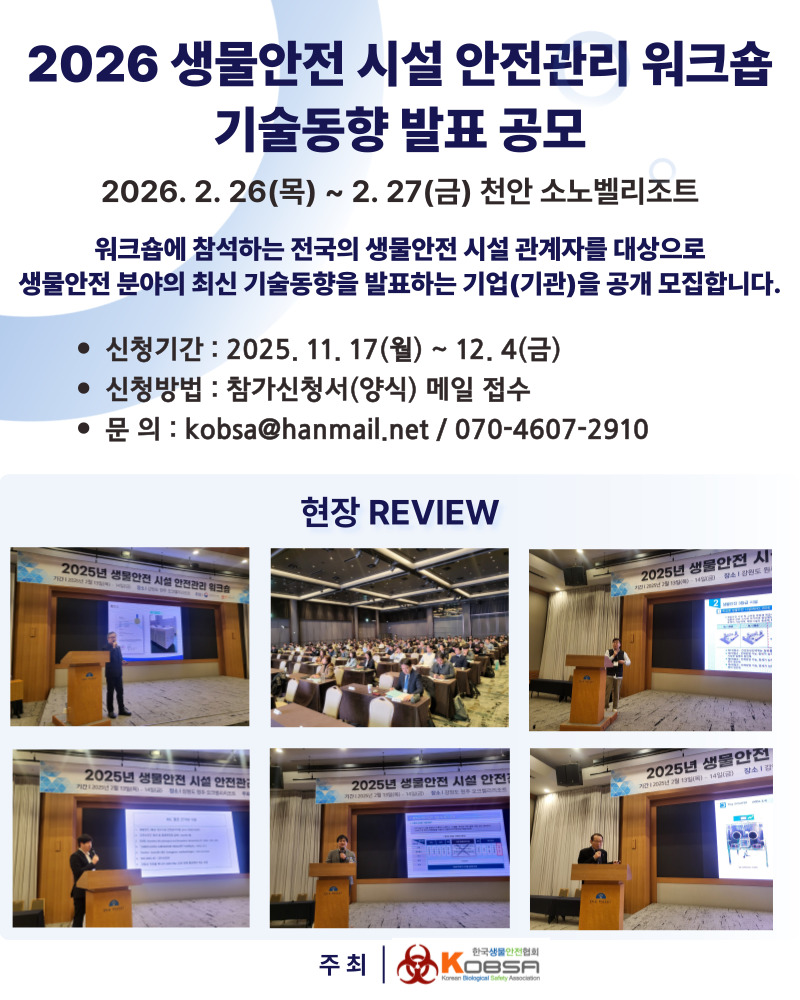 2026년 생물안전 시설 안전관리 워크숍 기술동향 발표 공모 안내(접수 : 11.17~12.4)