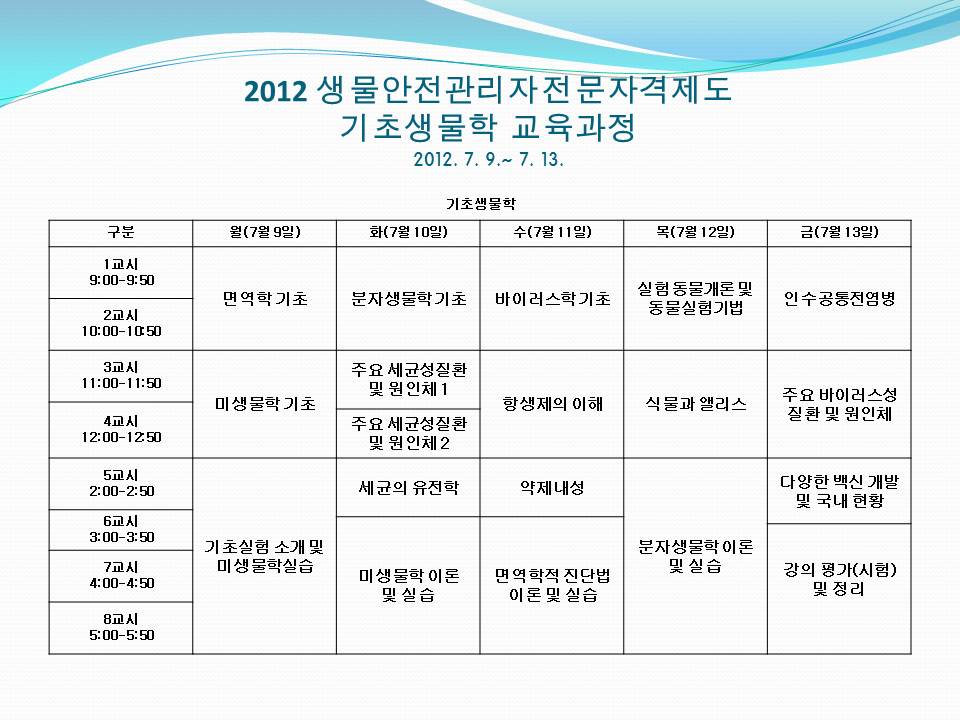 [KOBSA] 2012년 기초생물학 교육과정 시간표(7.9~7.13) 작성자 KOBSA 조회 3,015 작성일 2012-06-28 * 일정은 변경될 수 있습니다. 이전글 다음글 목록