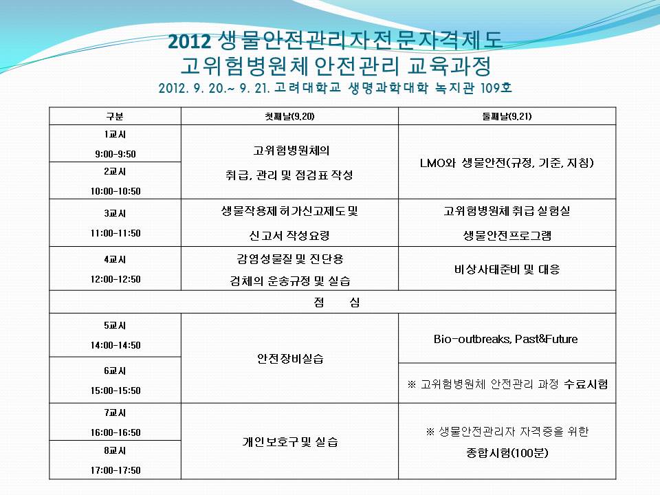 [KOBSA] 2012 고위험병원체 안전관리 교육과정 시간표(9.20~9.21) 작성자 KOBSA 조회 3,418 작성일 2012-08-30 * 일정은 협회 사정에 따라 변경될 수 있습니다. 첨부파일 시간표.jpg 이전글 다음글 목록